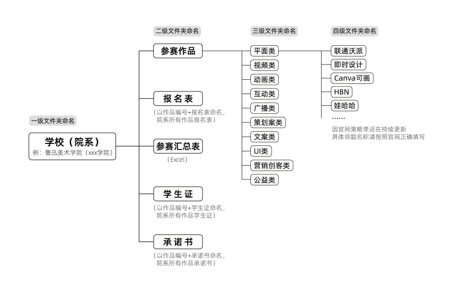 ②、图一中四级文件夹命名及内容以平面广告为例,视频类等以此类推,具体命题名称请按大广赛官网正确填写;